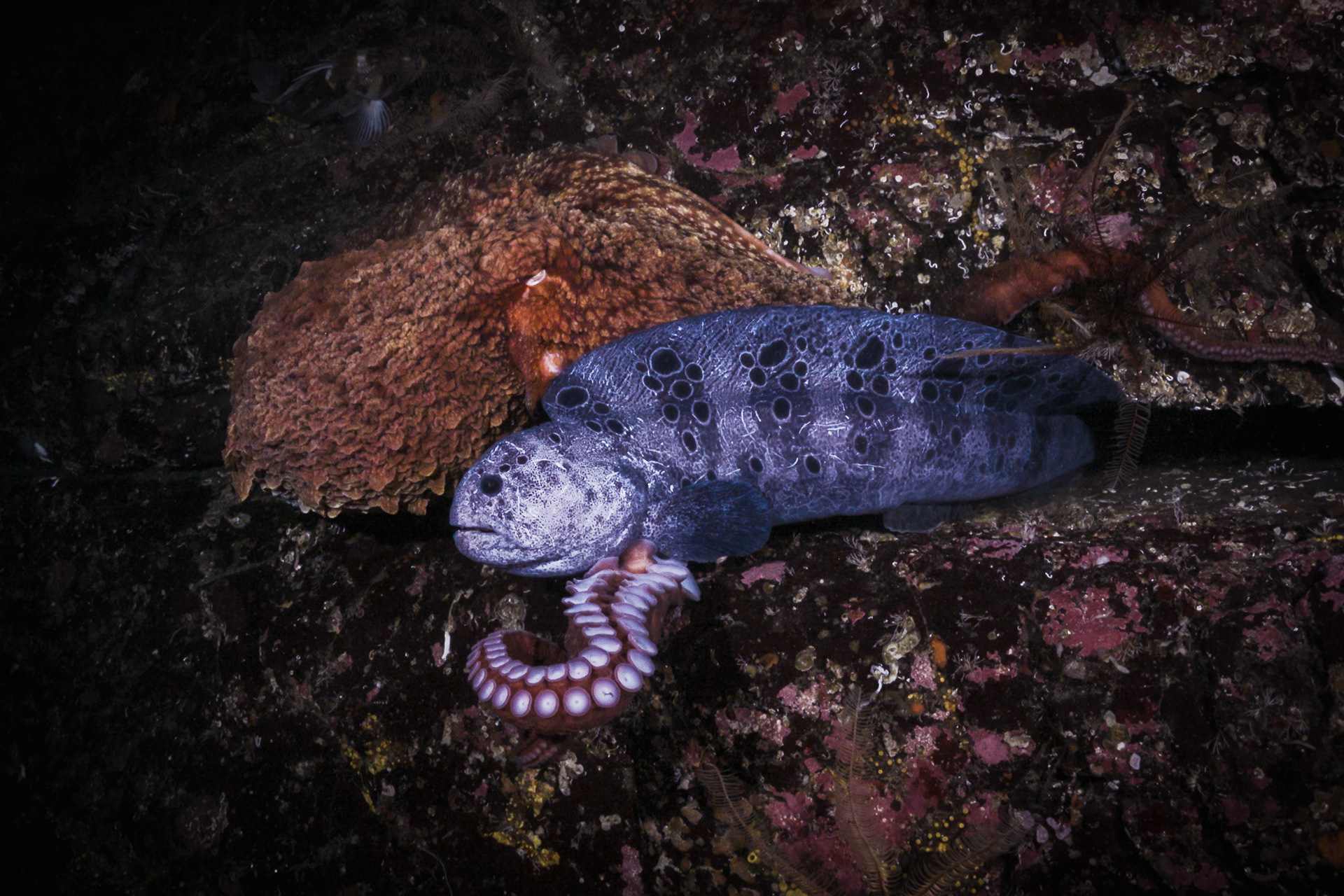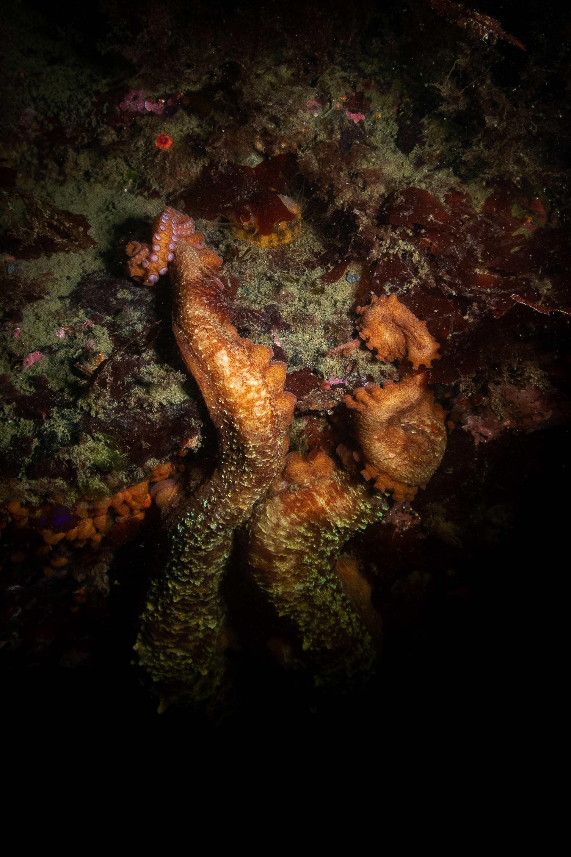 Some remain tucked into their dens, arms coiled with quiet strength. Others reach out, curious, tasting the current with thousands of sensitive suckers. Every interaction feels deliberate.